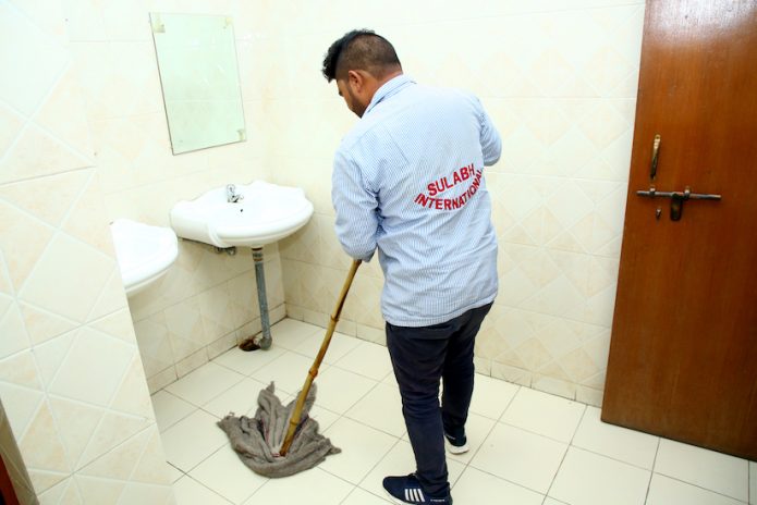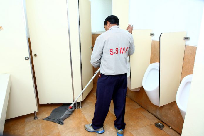 • Scrub and mop the washroom floor from inside to outside.